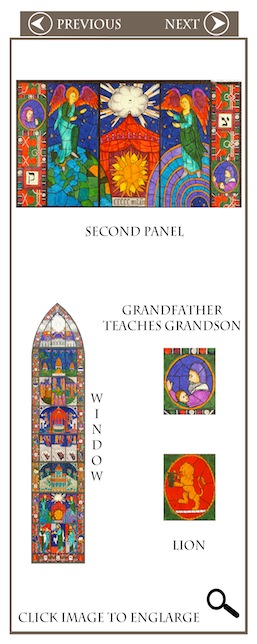 Professor Loewe’s translation of the Seven Heavens poem by Isaac b. Moses, which is read on the Sabbath preceding New Year. He also worked alongside the artist Michael Hall to design a stained-glass window. The window is a visual interpretation of the poem. The viewer should begin at the second panel from the bottom, go up to the top and finish back down on the bottom panel, as was traditional in medieval stained-glass.